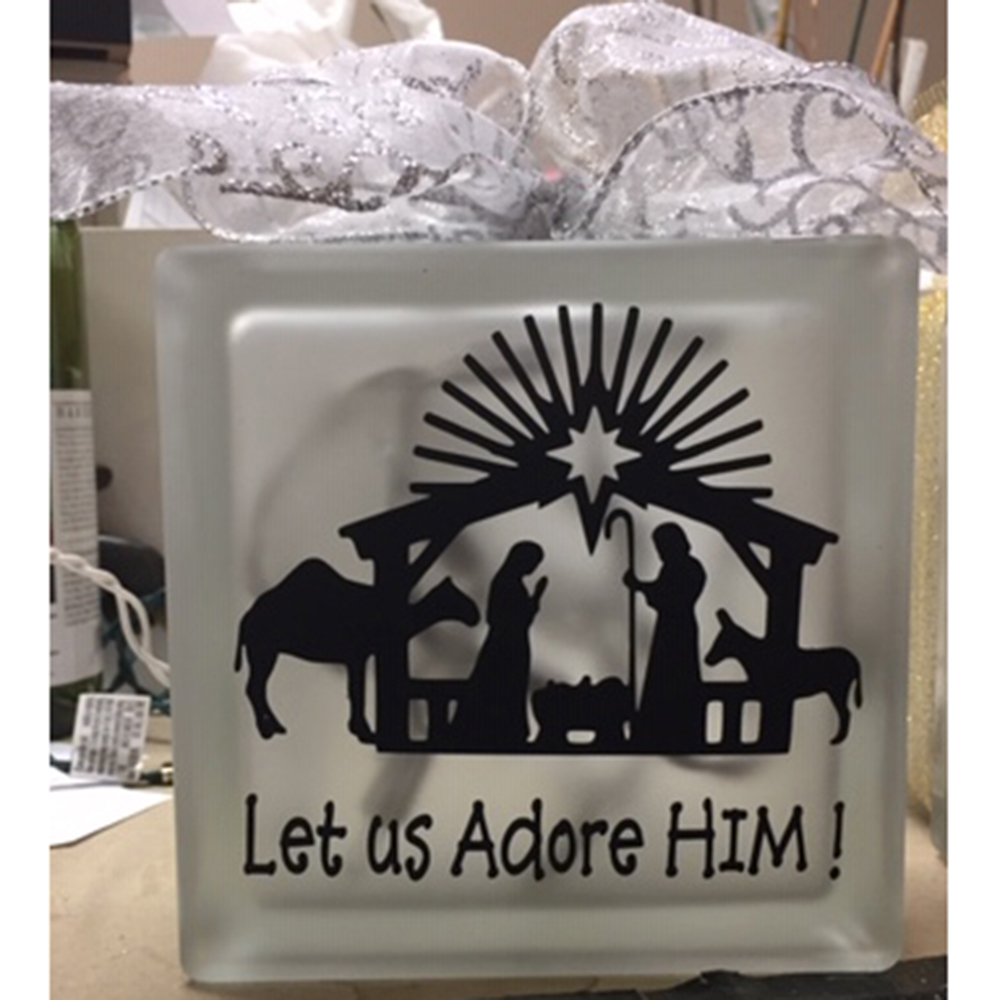 Xmas "Let us Adore Him" cube w/lights.